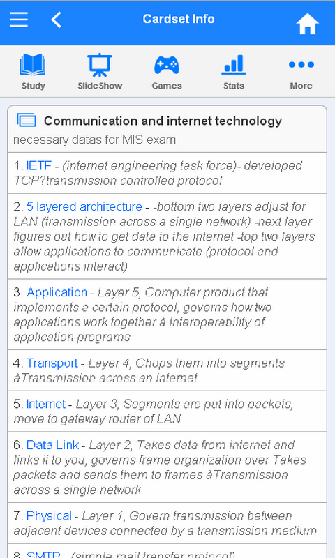 Using Flashcard will help you learn faster and remember more in a shorter time by showing flashcards just before you will forget them. MIS Flashcards app has several learning modes: Study, Slide show, Matching, Memorize, Quiz to make the learning process for MIS exam more exciting and fun.
