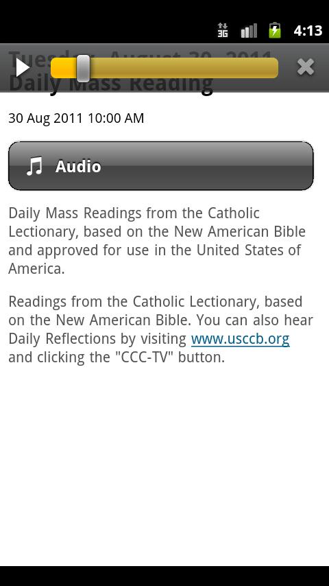 Listen to today's mass right on your device with this application. You can also read the Daily Readings to get a better understanding of the mass service and follow along easier while you are at Church.