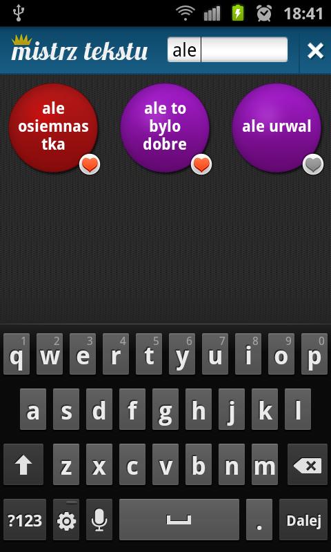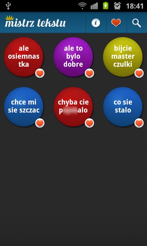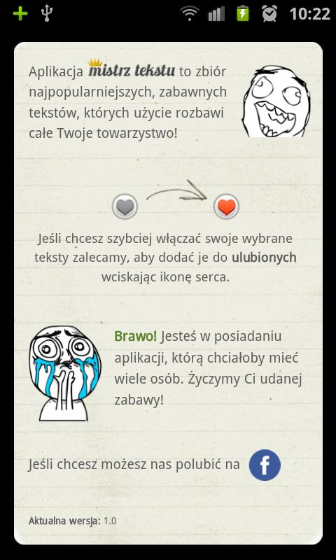 Wśród tekstów aplikacji znajdziesz takie klasyki jak "ale urwał!", "jem zupę", "siema heniu", "jestem hardkorem", "siła", "recket fuel", "miota nim jak szatan", "lubie placki", "moje pole", "koniec imprezy", "ale osiemnastka", "to jest amelinium", "forfiter", "co się stało", "kadetem tera", "ale to było dobre", "będę grał w grę", "babciu", "chce mi się szczać", "cycki se usmaż", "daj kamienia", "dykty ciężkie", "jedziemy dawaj malina", "krew się poleje", "lubisz to suko", "matka wie, że ćpiesz", "nie ma lipy", "nie no co Ty tato", "nie ma takiego bicia", "parabole", "połowa służb", "super partia", "top model", "śmiech waldusia", "trzy słowa", "trolooo", "urwiesz mi", "mleko", "zalegalizować marihuanę" itp.Welcome to Facebook: http://www.facebook.com/MistrzTekstu