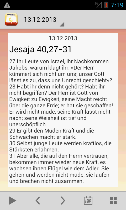 - Schriftgröße skalierbar Warning: This is not the app for 2015. Unfortunately had the middle App for financial reasons in its present form will set the book there are only 2015, the CD-ROM with all read Bible texts and explanations was not already in 2015 longer produced. But there was a lot of good feedback on the apps at the same time, it is planned from 2016 again comparable with the middle-App App offer. The app can also be used in 2014. In 2015, if you select the dates manually.