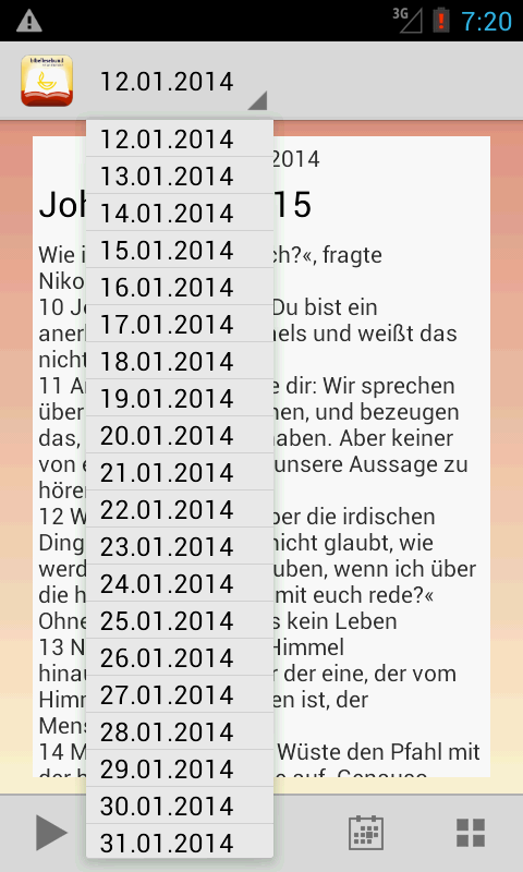 Achtung: Dies ist nicht die App für 2015. Leider musste die mittendrin-App aus finanziellen Gründen in ihrer bisherigen Form eingestellt werden, das Buch gibt es nur noch für 2015, die CD-Rom mit allen gelesenen Bibeltexten und Erklärungen wurde bereits für 2015 nicht mehr produziert. Da es gleichzeitig aber viele gute Rückmeldungen zu den Apps gab, ist geplant, ab 2016 wieder eine mit der mittendrin-App vergleichbare App anzubieten. Die App für 2014 kann auch im Jahr 2015 benutzt werden, wenn man die Tage manuell auswählt.