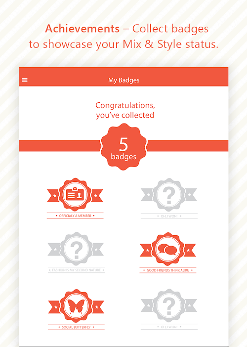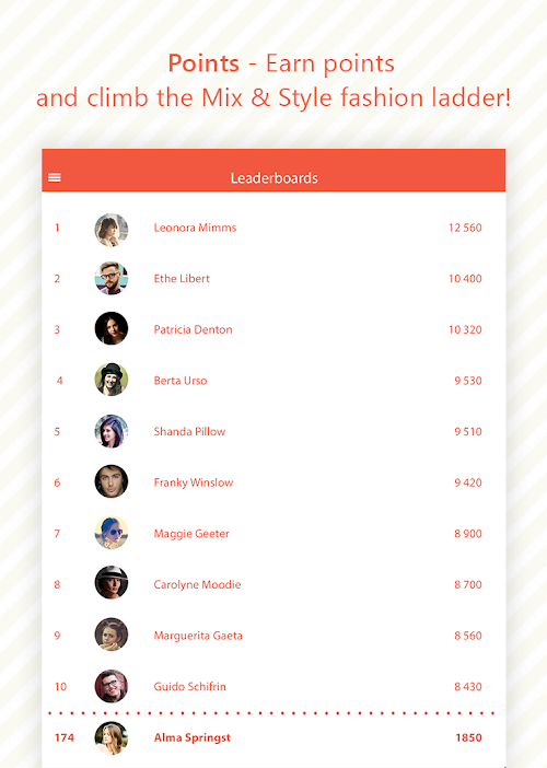 You are rewarded for all the stylish, fashion things you do inside the app! You will be able to accumulate points and achievements and climb the Mix & Style fashion ladder!