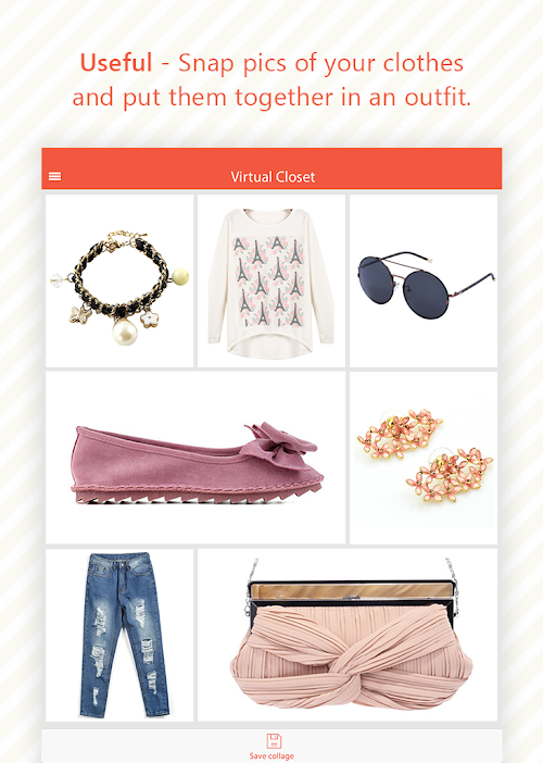 We have developed a new, easy way for you to organize your clothes and create your fashion closet. All that you need to do is photograph the items that you want in your outfit and place them all in a collage – it`s that simple to create your style outfit.