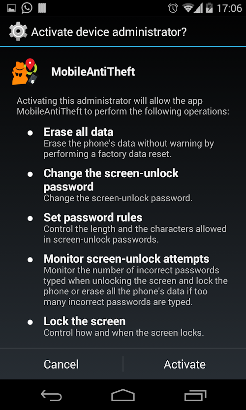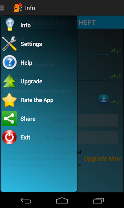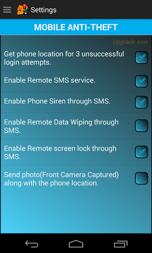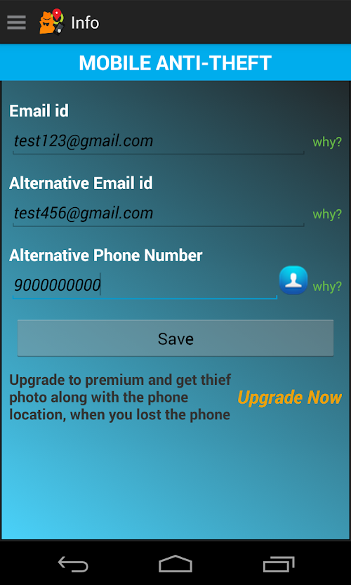 Mobile Anti Theft is a powerful application which helps to track your lost android phone easily. When phone get stolen/lost and SIM card is changed, app sends current location of the phone through SMS and email to the alternative mobile number and email ids provided. We also have a option to capture theftie with front cam and the captured picture will be sent to the email ids. You can also control your lost phone with remote features after receiving SMS from newly inserted SIM.