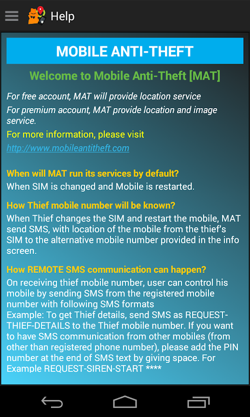 ■ Can get phone location and theftie (by using front camera) whenever required, by sending SMS as REQUEST-THIEF-DETAILS to the thief phone number (for SMS formats go through : http://aapthitech.com/mobileantitheft/faq.html ).