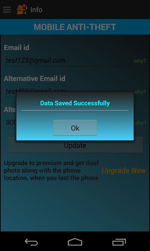 ■ Sends current Geo Location of phone and Thief image, when SIM is changed and phone is restarted. Details will be send to the registered Email ID and phone number from the thief SIM.