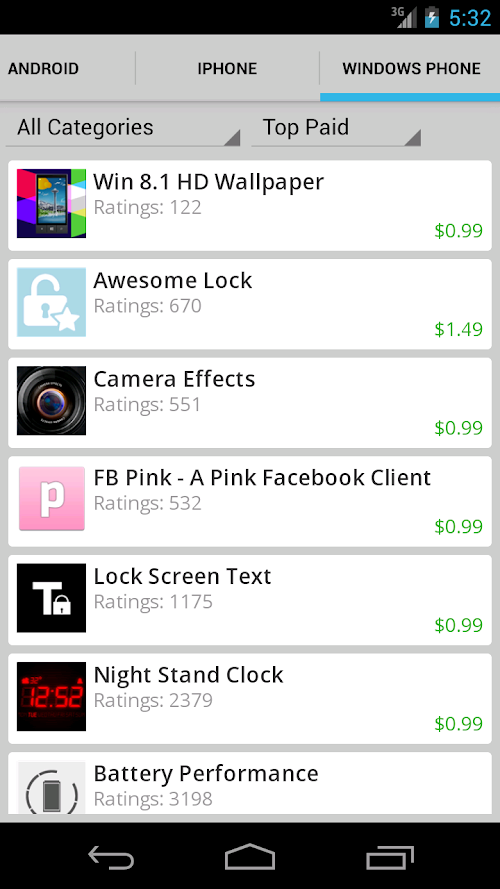 - Top free, Top Paid ,Top Grossing and other apps are available.