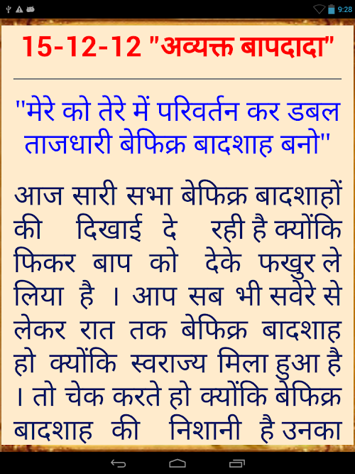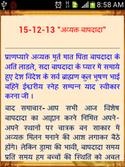 After the BIG success of Mobile Murli App (https://play.google.com/store/apps/details?id=com.omshanti.mobilemurli), here comes another gem for Brahmin Family, the Mobile Avyakt Murli App !