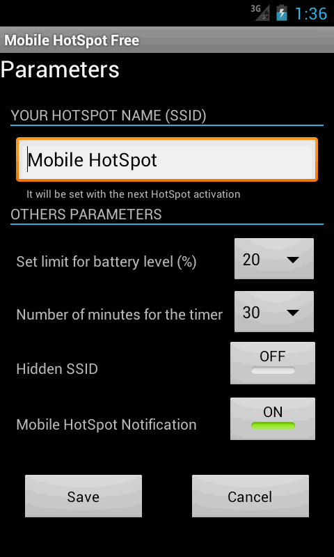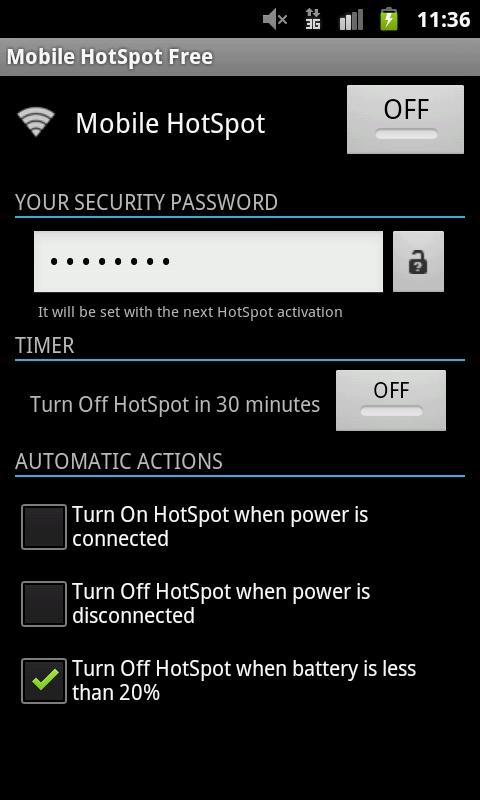 Also you can automatically activate your HotSpot as you connect your phone on AC or USB power. In the same way, as you disconnect your phone from a power source you can automatically turn off the HotSpot application.