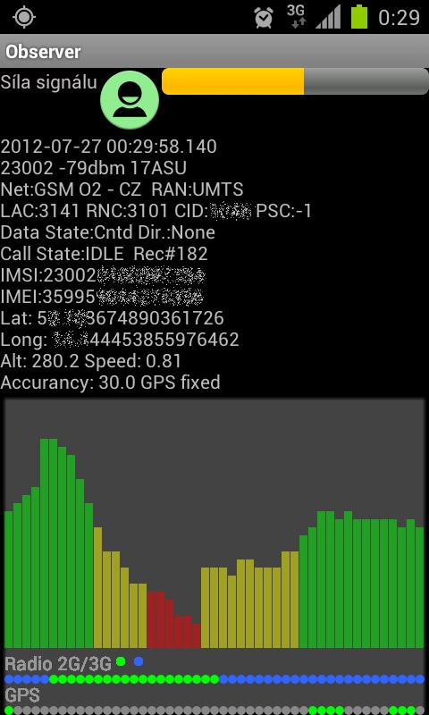 Marked 2g (green) and 3g (blue) signal in the map view.