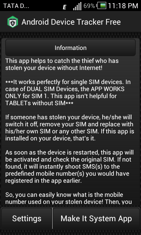 As soon as the device is restarted, this app will be activated and check the original SIM. If not found, it will instantly shoot SMS(s) to the predefined mobile number(s) you would have registered in the app earlier.