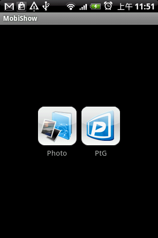 You can use MobiShow to do the PC-less Interactive presentation using the PtG Feature. When the PtG file is open, the PtG slides will be projected, and the following screen is displayed on your phone for you to control your PtG presentation.