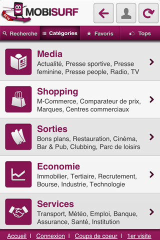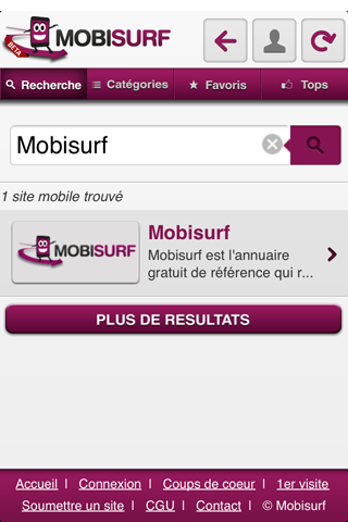- des fonctionnalités conviviales : les coups de coeur, les nouveaux sites mobiles, les sites les plus visités et les Favoris.Mobisurf is the first mobile directory that lists free and general websites suitable for all mobile smartphones last generation.