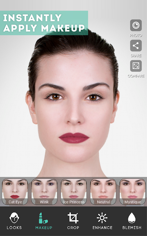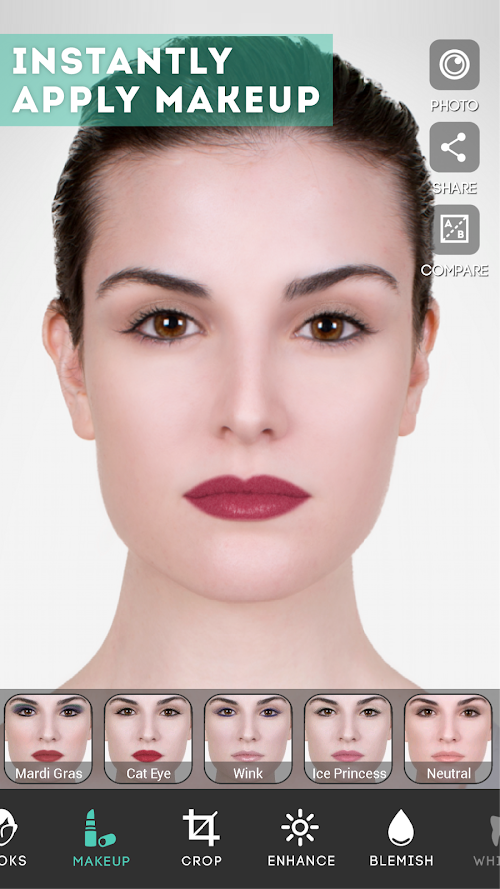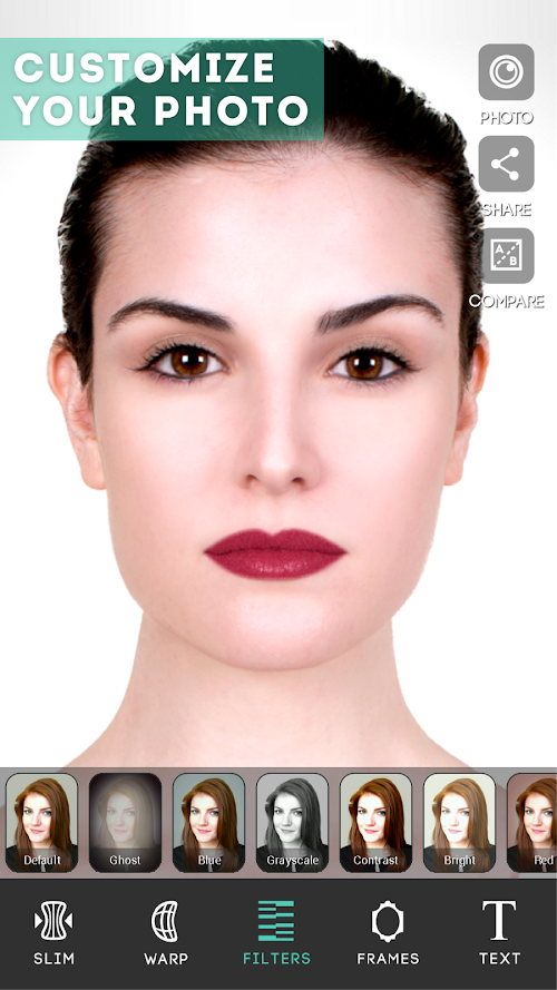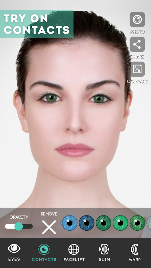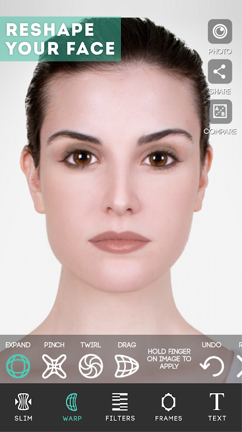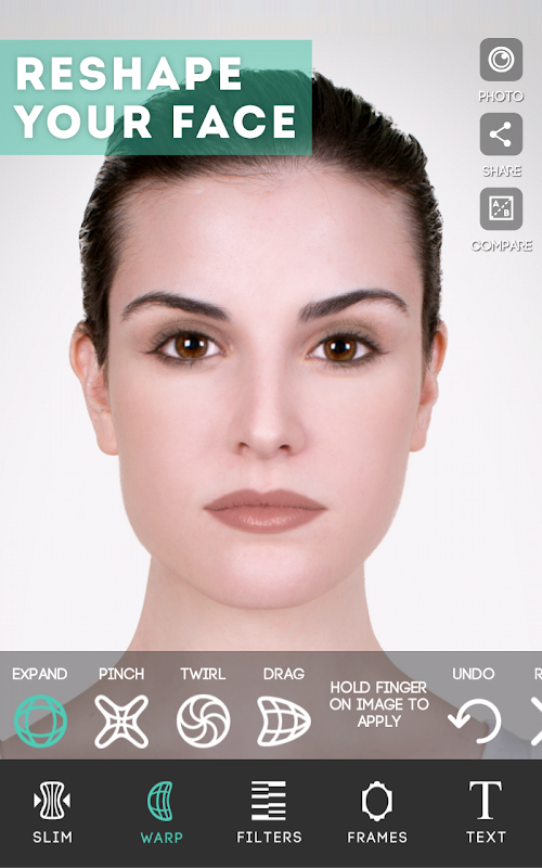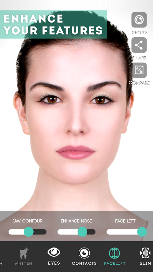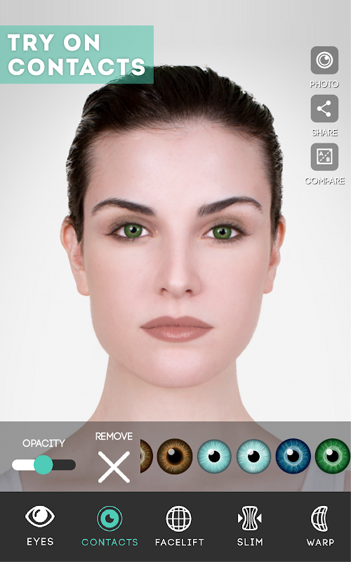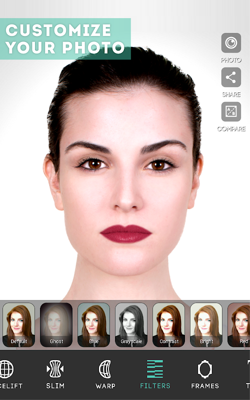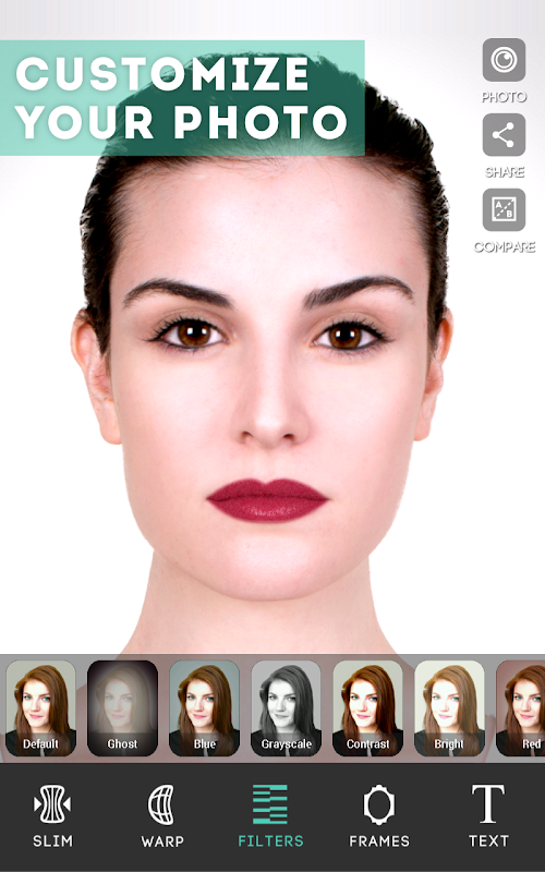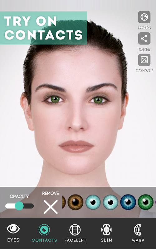 ModiFace Photo Editor features our state-of-the-art cosmetics/makeup simulation, as well as skin and facial enhancement effects. Other great features include blemish removal, teeth whitening, color contacts, facial/body slimming, and even warping. To finalize your photo, you can crop, add filter, frame, and text, and instantly share your polished result with your friends and family!