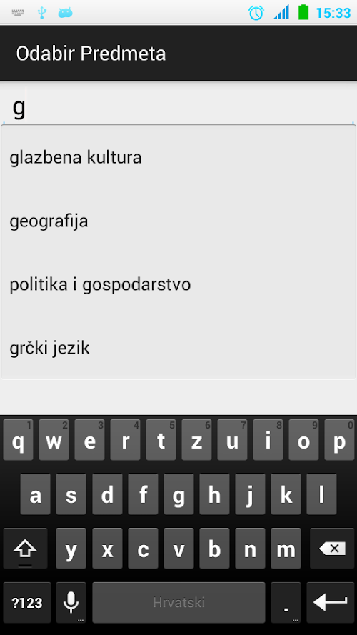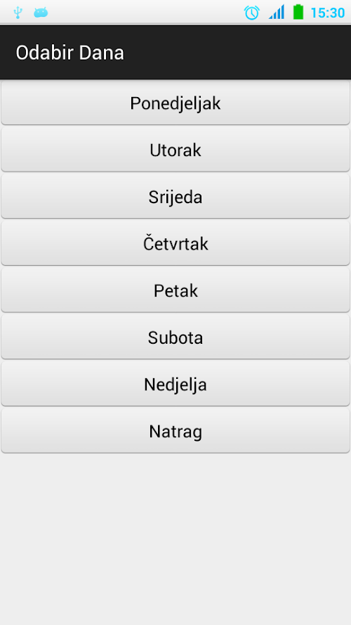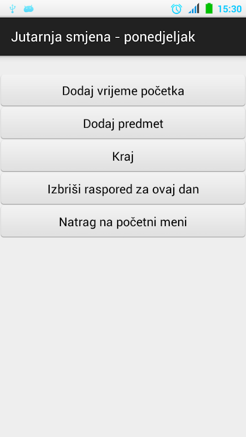 Zatim se za svaki dan unose predmeti. Vrijeme početka nastave (ili vrijeme početka svakog sata) se može odrediti odabirom tipke "Dodaj vrijeme početka" gdje se određuje vrijeme (od 0 do 24 sata) početka. Odabirom tipke "Dodaj predmet" prelazi se na ekran za odabir predmeta. Postoji niz unaprijed ponuđenih predmeta, potrebno je samo unijeti početno slovo.