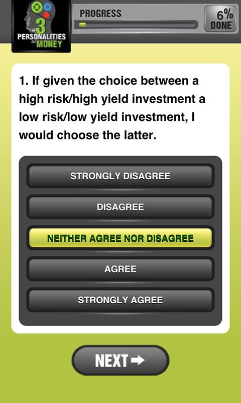 The 3 Personalities of Money® Financial Profile 3-minute test is not intended to pigeonhole or oversimplify anyone. It does not pretend to be the instant cure for your financial ills and frustrations. Rather, this simple test – which was devised and tested by unbiased academics in the field of Psychology - has one objective: to help Savers, Investors and Speculators define and discover their true financial personality so they can feel more comfortable about who they are and where to invest their money. It was not developed nor conceived by the Financial world looking to garner more of your money, but rather by someone who has spent thousands of hours, face to face, with consumers just like you.