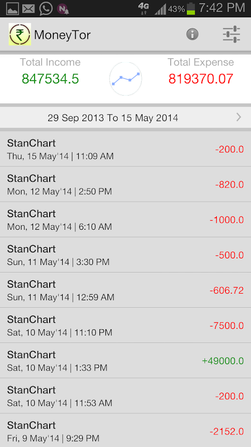 MoneyTor application will provide you all your bank transaction at one place. It will not require your bank credentials, what it requires only the bank transaction message format. The user can also view graph of the transactions in a particular period enabling easy analysis of expenditure. It also provides user with different filtering options.