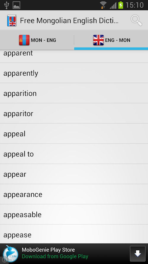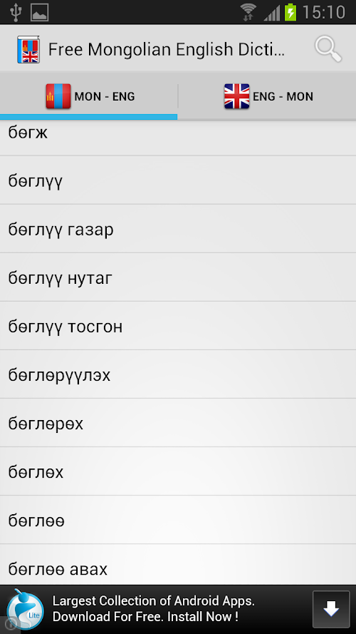 You are downloading an absolutely free Mongolian - English Dictionary (Монгол - Англи толь бичиг), this is an offline dictionary which does not need Internet connection to work.