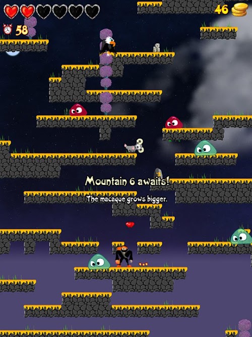 In this fun and fast platform game you will flick and tap your way up Monkey Mountain, defeating slimes, goats and the mighty Macaque. But don't fall... it's a long way doooooooooown!