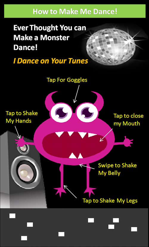 Monster dance is a cute application with a lovely Pink Monster. He love dancing but need instructions. Can you help him?. Just open the application, tap on his body part and help him to dance. You can