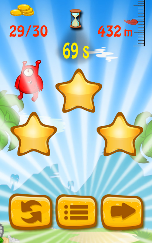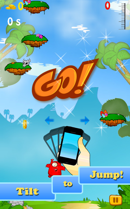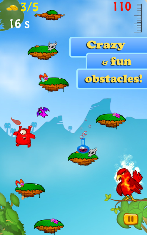 The red smiling chubby can “jump around” and bounce from one platform to other moving or stationary – you just need to tilt your tablet or phone to the left or to the right so as to control the direction of its jump. The aim of this action game is to collect the coins while you avoid obstacles and get to the end of the level without falling down. If the monster runs off the platform and falls – game over! Still, beware! This is not one of those usual jumping games. You can land only once on some of the platforms, since they tend to disappear after the first landing. And that's not all! Stay away from the annoying bat that can disturb your balance if you get too close to it and from the evil cloud with an ominous grin, because the screen will instantly become misty and blurred. If you take the poison, right will become left and left right. Also, the fuzzy creature can make an extreme jump if it lands on the awesome yellow snake,so as to avoid many obstacles. You can get a shield to protect you from the annoying bird. It is vital for the beautiful monster to collect as many coins as possible, since new stages can be unlocked only if you collect enough. Since the amount of collected coins is measured by three stars, you need 20% of the coins for one star, 40% for two and 70% for three stars.