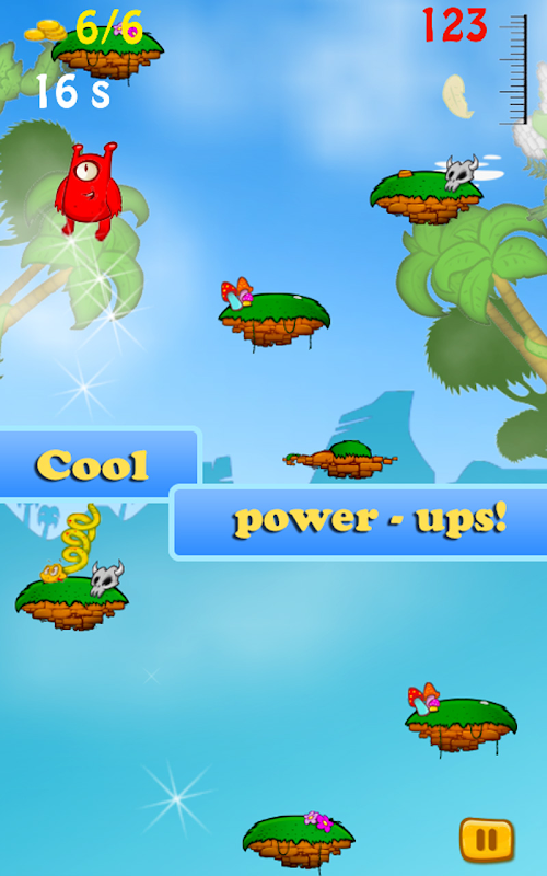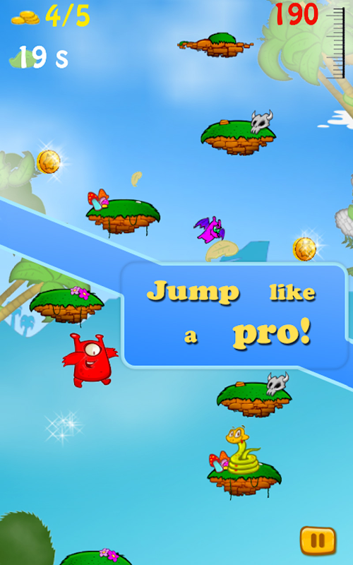 Monster Jump takes you to an epic jumping adventure with the help of a wacky monster! You will make this fuzzy little monster jump sky high - download this platformer for free and see for yourself how easy it is to jump high. Fun starts here, with this cool game - the outstanding graphics combined with the red monster's cool island adventure will keep you on your toes for hours. In the midst of an exotic island scenery with beautiful palm trees and gorgeous greenery, a fun monster begins its journey. It's monster fun time!
