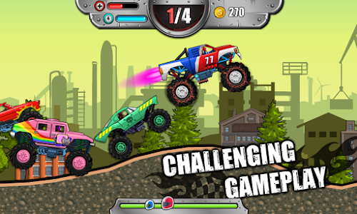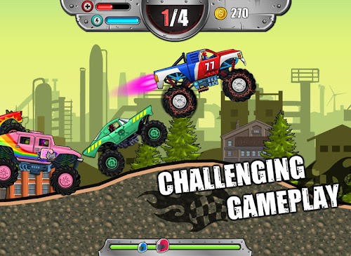 Still think you are ready then pick up your device select one of the insane monster trucks. Start the first race and see for yourself if you can beat this monster truck driving madness. Yeah thats right this game is not for the sunday drivers, no sir its full of adrenaline, pumping action. Mighty engine sounds, splattering oil and gasoline, petrol guzzling engines.