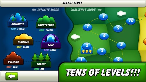 - 6 different infinite maps (Countryside, Down Hill, Cave, Highway, Volcano, Forest) to race repeatedly