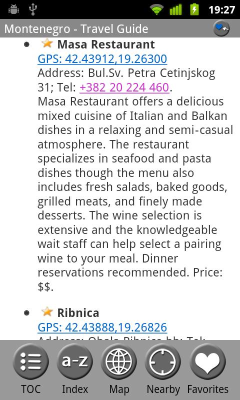 ✔ The top restaurants have been individually selected by MobileReference editors. These restaurants are marked by a star in the EAT chapter and are plotted on the GPS map.