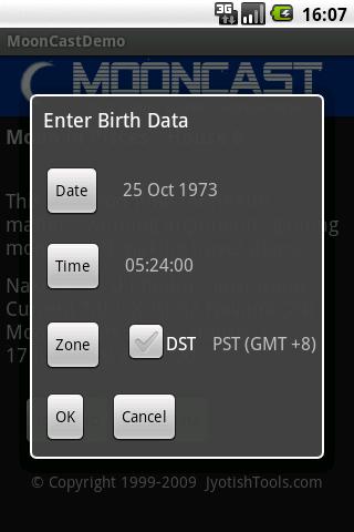 MoonCast provides your presonal daily lunar horoscope by Vedic Astrology. Anyone can use MoonCast. No knowledge of astrology is required. Moon sign, birth star (Nakshatra) and Tithi are also provided. Demo version available in the Demo section to try before buying.