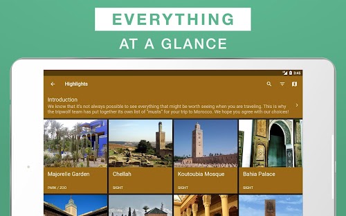 The Morocco travel guide app is free and contains optional in-app purchases. Free content includes overviews of all important places, as well as access to content from Wikipedia, Yelp, Foursquare, Quandoo and Booking.com. Functions such as day planner, routing and maps are available online.