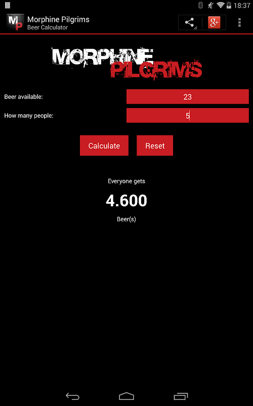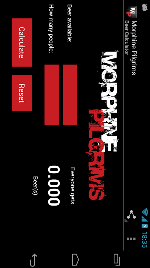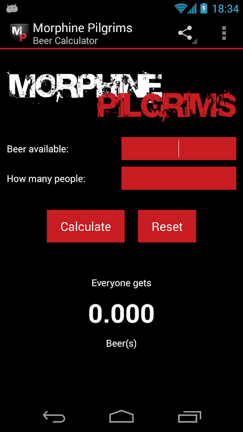 Make what our politicians have been promising us for years a reality today: distributive equality!!! The Morphine Pilgrims beer calculator shows you exactly how many beers each party guest deserves. We have spared no costs, hired the best programmers and maximized ease of operation to ensure that our app can be operated in virtually every state (of mind), be it day or night. Just enter the number of beers available & click on "Calculate" - and refill the fridge just in case.