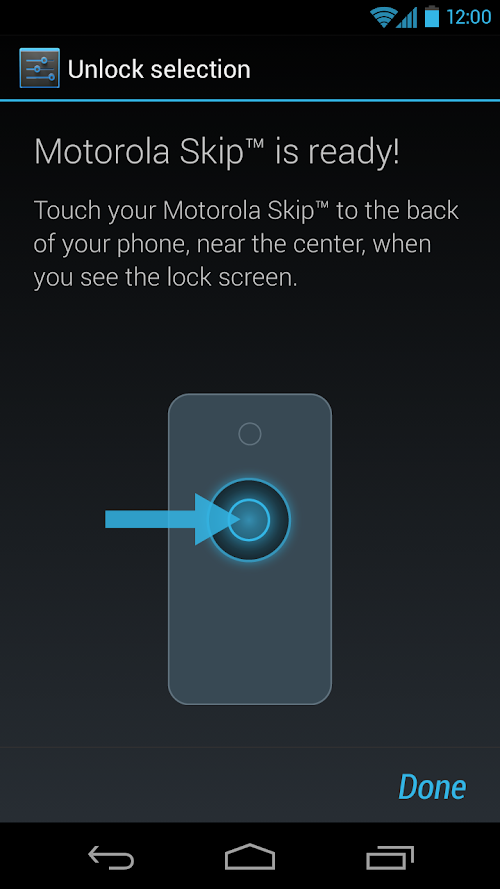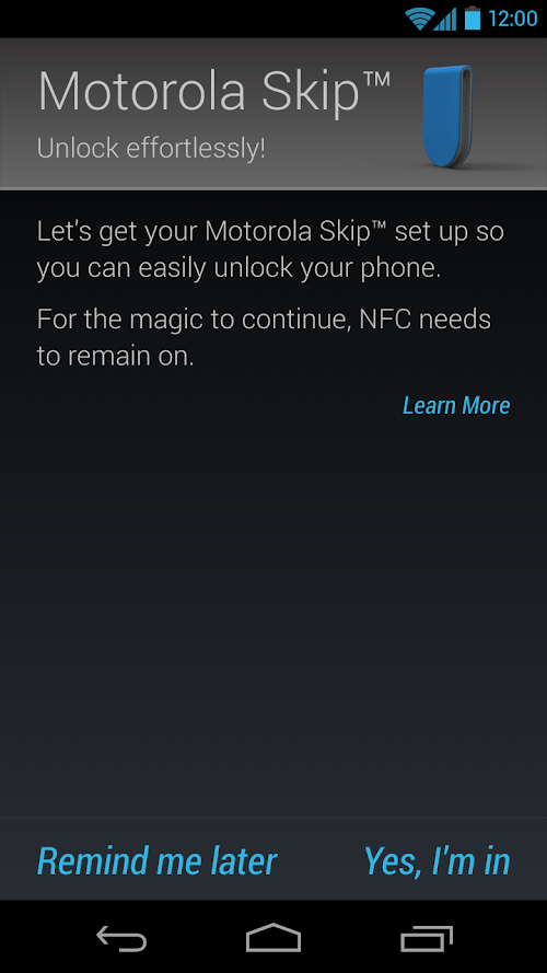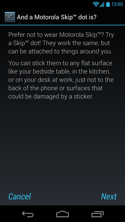 To set up your Motorola Skip and Skip dots, download this app. Then make sure NFC is enabled, tap your Skip or Skip dot to the back of your Moto X and follow the onscreen instructions.