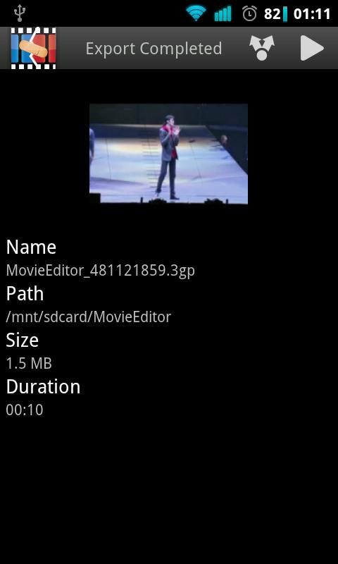 After the export operation is complete, a screen with information about the new video will be shown and you will be able to play or share (upload to YouTube, Facebook, send E-mail, etc.) directly through the application.