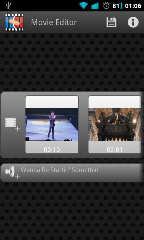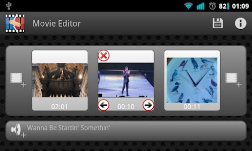 You can add videos from your gallery to the timeline and arrange them as you like. Select a file from your music collection and set it as the soundtrack of the movie.