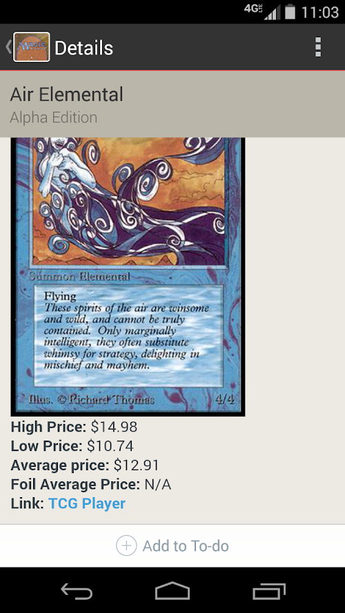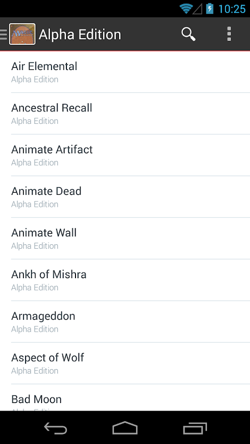 This app is a pricing guide for the Magic: The Gathering card game. It features cards from all standard blocks from Alpha and Beta through the most current sets and many expansions such as Legends, Conspiracy, and From the Vault. This app contains all card information OFFLINE, meaning that you don’t have to have an internet connection to view card or pricing information. Content is updated once daily, and after the update downloads, you do not need an internet connection to view the information. This means that you can use the app in places where you don’t get an active cell signal (like your local game store, a friend’s house, or tournament space).