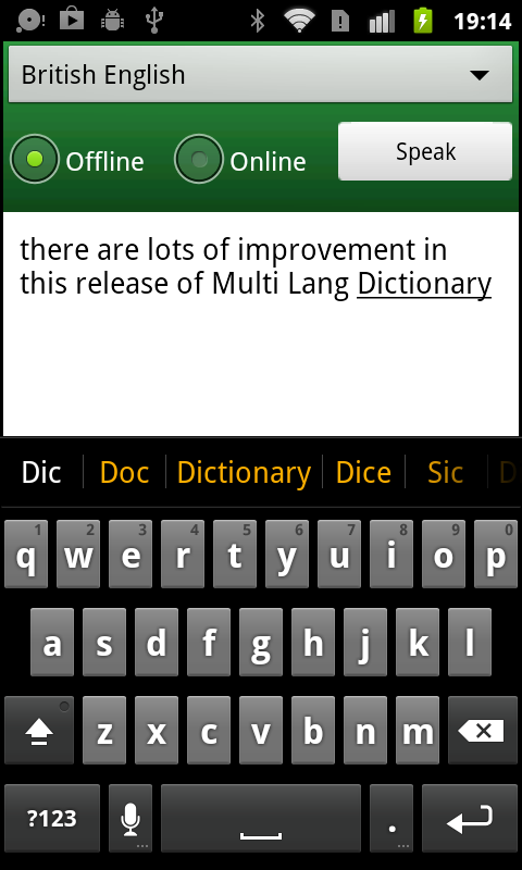 The Multi Lang Dictionary for Android is the fastest, most efficient dictionary and translator with Google Dictionary, Google Translate, Wiktionary, Offline Dictionary reader and a super sweet interface to wrap it all up!