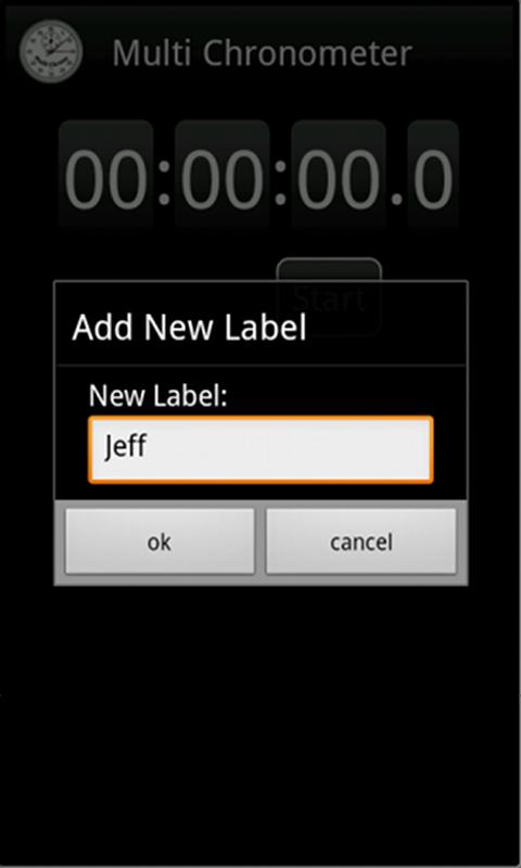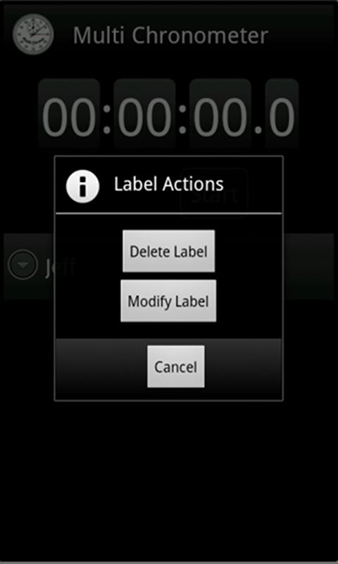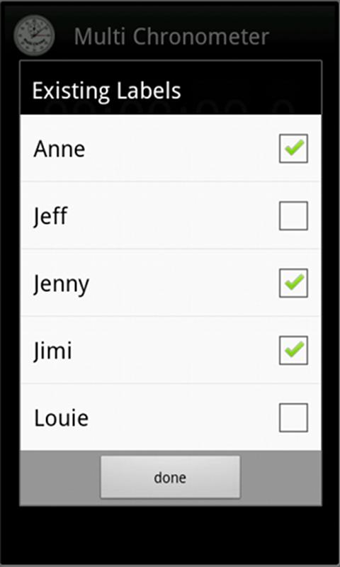 You can add, modify and delete as many labels to/from the list of contestants as you require and see fit. Once a label is added to the app MultiChrono remembers it so you do not have to type it in every single time. Simply browse the existing contestants and add or remove them to/from the list of contestants on the screen.