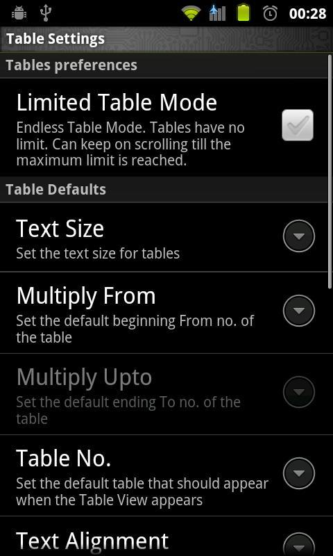 Limited Table Mode: Tables load from a specified from value to a specified to value (which can be set in the settings).