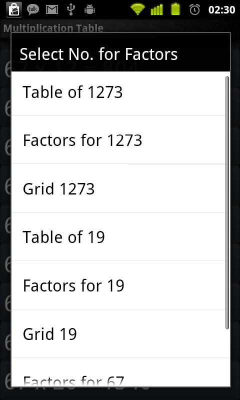 1. Open “Multiplication Tables” from the home screen to view the tables of a number from 1 to 20 (Try ‘Endless Mode’ in Settings). Click on any item to open it's quick factor info. Long click for loading the table, factors or Grid of all the numbers present in the table item.