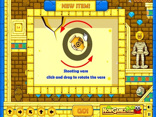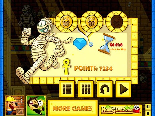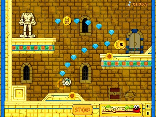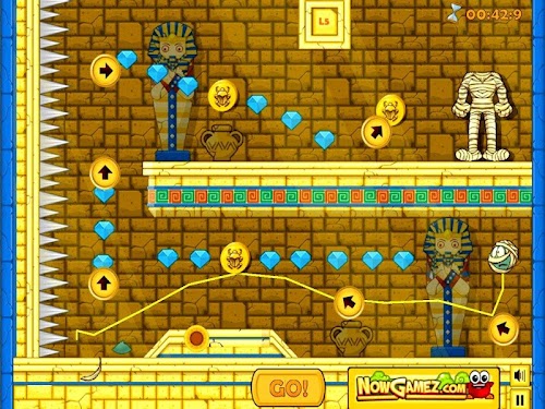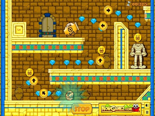 This game has 36 levels to play and in each level you have to get the head of the mummy back on his body. You do this by drag and drop the moving icons to the right spot in the field. Once you have done this you press the 'Go' button. The head will start rolling and each time you placed an icon on the right spot the head will change direction. This is very hard to do so you can try again if this not results in completing the level. Find the perfect path to make mummy's head roll until it reaches the body, taking as much diamonds as you can along the way and collecting all the golden bugs to unlock all levels.