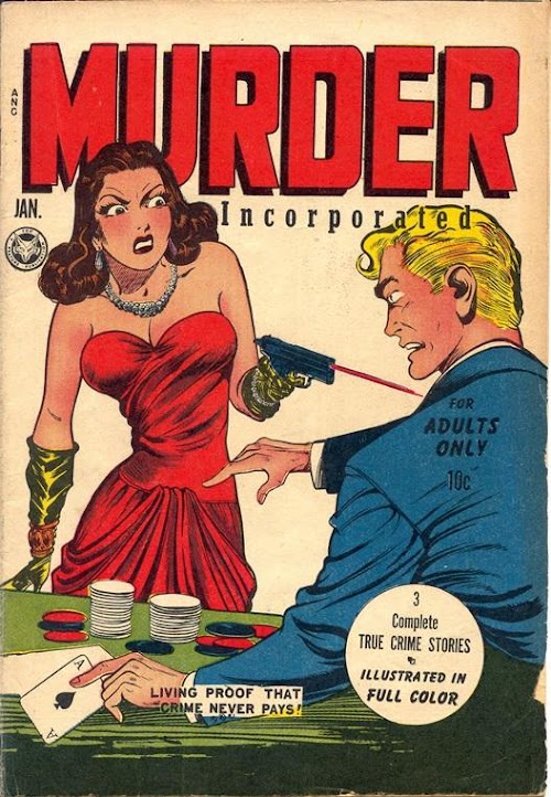 Murder Incorporated attempted to be one of the most shocking of the crime genre. The covers of the first two issues had the words 'For Adults Only'. This was not a legal requirement and in fact it could well have been a ploy to entice children and young adults to buy it.