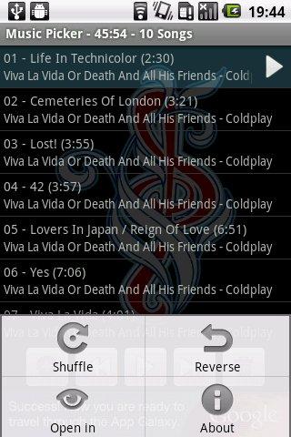 It also can be very funny to select a track via feeling related to the current situation. What? Think and feel about your current situation! What's up? Grab the Music Picker, choose a track by selecting the button that attracts you and look at the track title. Is it related to your situation? For example: One time I missed my new girl friend (don't tell her), then I grabbed the Music Picker, choosed a track and it was "Rammstein - Sehnsucht". A german song about desire. I laughed, listened to the song and after that the desire was less then before and I felt better and looked forward to see her again, instead of missing her and being sad.