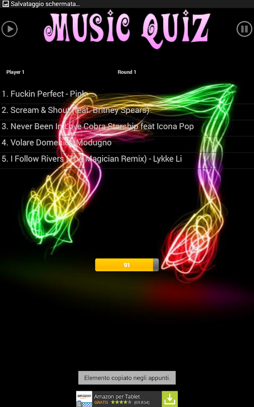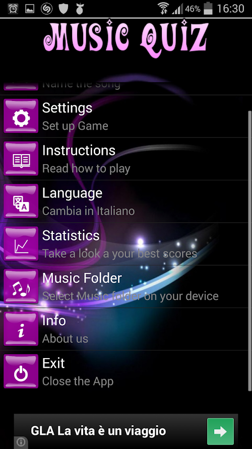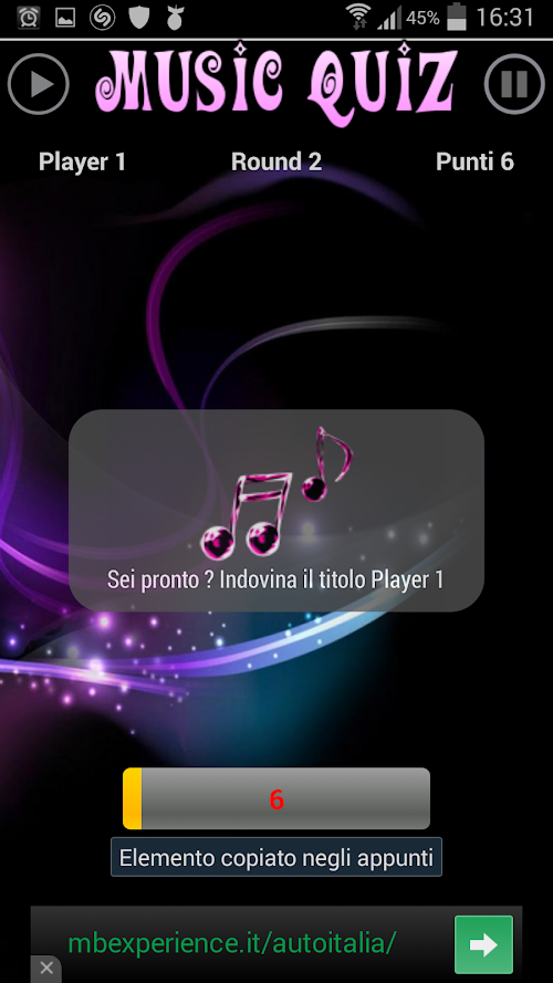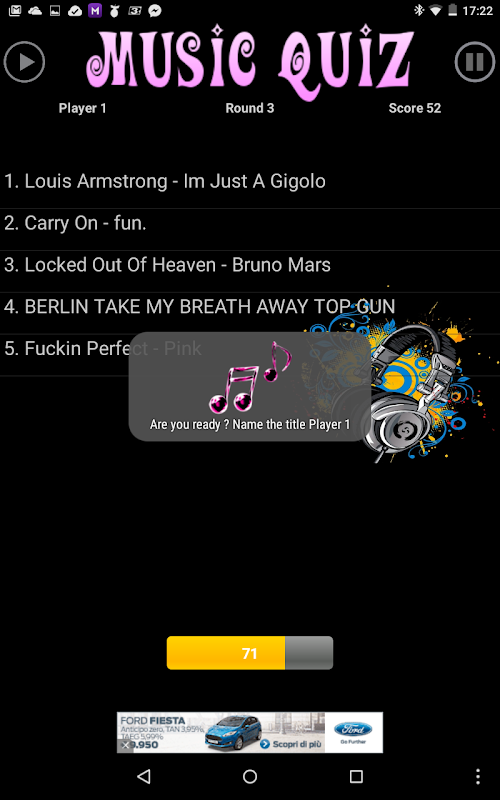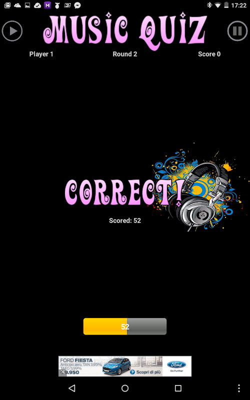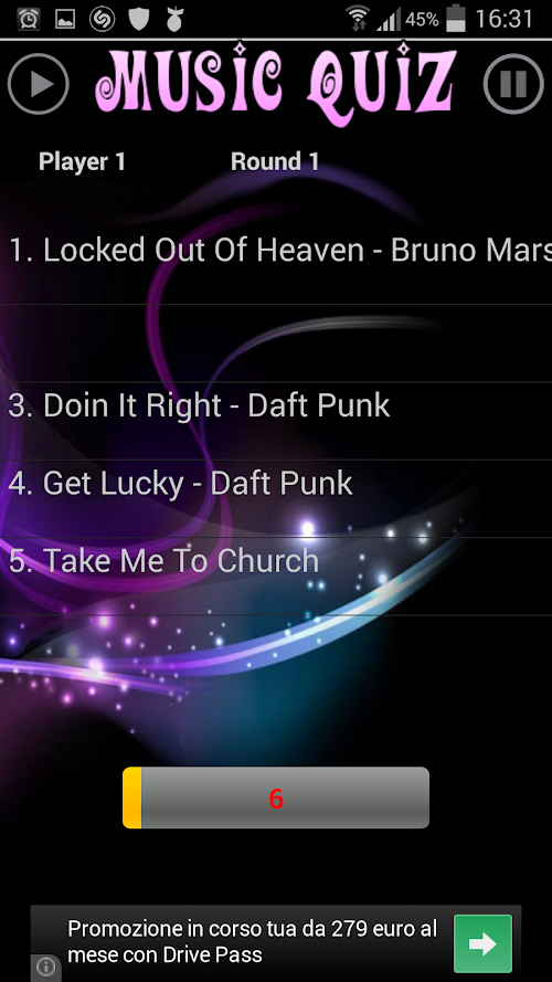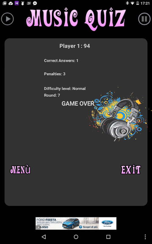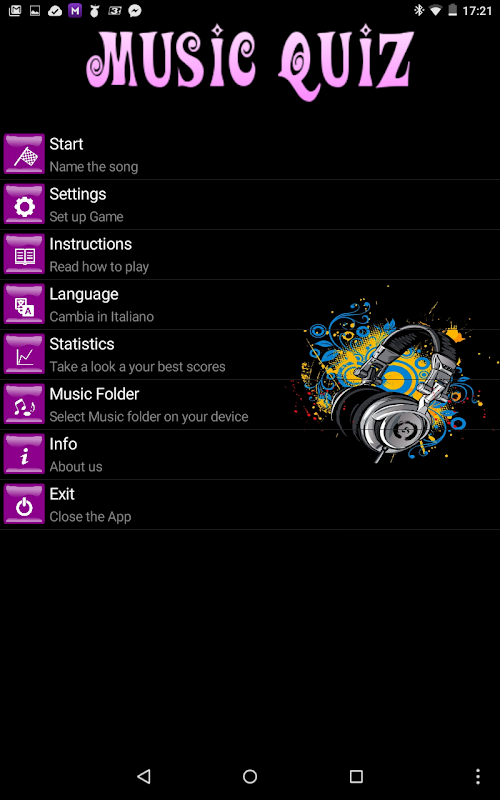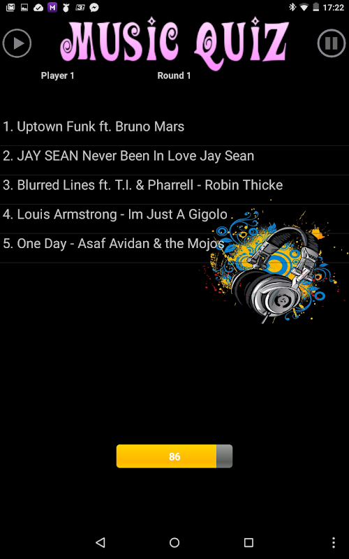 Music-Quiz is a free game to play with your music, have fun with songs that you already have on your device. With three difficulty levels you will be challenged with your own music library in fact you have to listen to your music and try to name the title you are listening to as fast as you can, but if you choose the wrong title you will get a penalty so be careful.