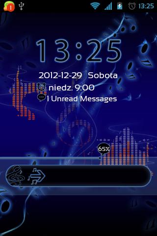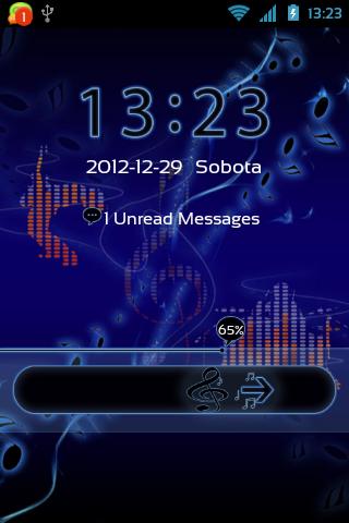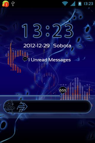 No matter if You can read music score or not, You surely know the treble clef shape. Its shape and little, cute notes are the world wide symbol of music, positive energy, greatness and all that comes down to the sound. It’s all about the background in Locker, so out motive here is mix of great dark, deep colors. Fantastic navy blue is fading into deep, striking black. There are used different shapes connected to the music topic. You will see extraordinary figure of a dancing person, great, absolutely amazing and crazy, colorful equalizer, which is the visualization of our music! All in amazing red and crimson. Although there are many little, cute notes in black color, that are arranged in the shape of lighting. In the middle is a big treble clef, and it is also used in the unlock slide bar with small, sweet notes. You must just tap it and slide to the right and it’s done! We’ve also changed clock graphic to be more suitable to our Locker Music Theme in pomegranate colours. Also icons like alarm new message and missing calls are now completely new and hypnotizing. When you when you connect battery charger, you will see amazing battery loading bar and battery level.