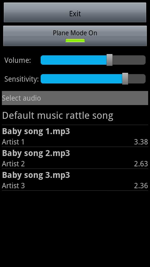 -Media volume control. Set the playback volume that the music rattle should use. When the application finishes the volume is restored to the setting when the application started.