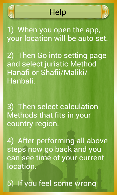 This app helps us to say our Daily Prayers on time, 5-times a day. When you open this app it will get your location and shows prayer times of that location just set Calculation Method and Juristic Method according your needs. It means where ever you are, you can know the prayer times of that place.
