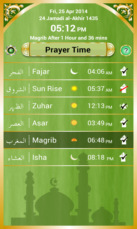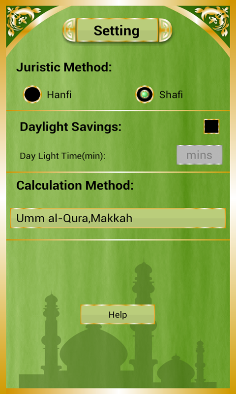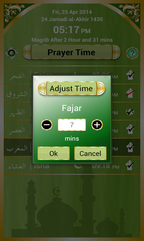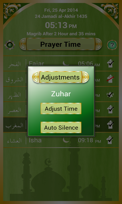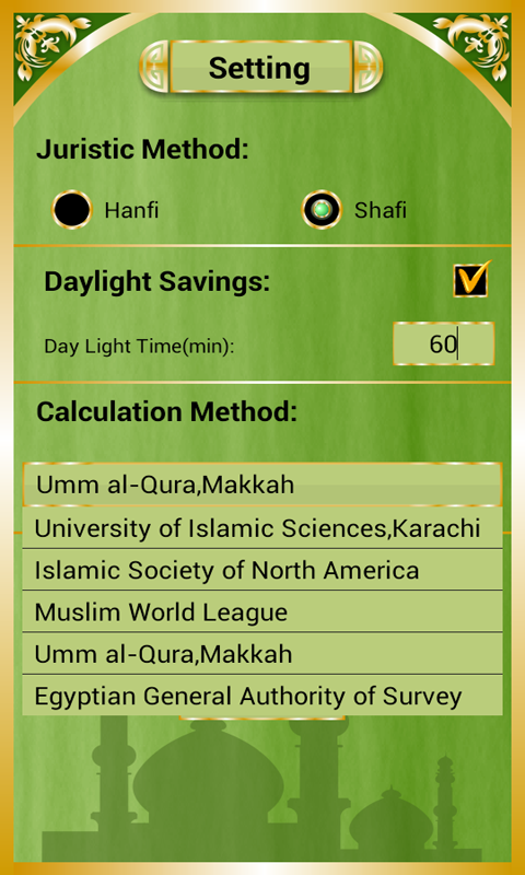 You can set alarm of either azan or voice message. We have added Daylight Saving option also to help our users. If there is slight difference in times, you can adjust it by clicking on that prayer and also can set Auto silent option from there.