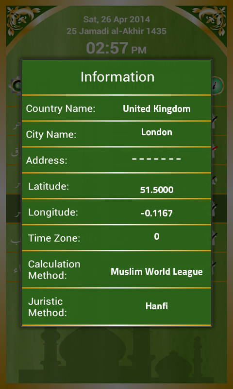 > After dialog setting page will be open just set Calculation Method and Juristic Method according your Continent Region.