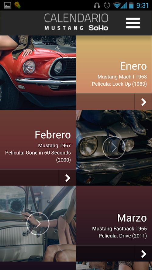 Esta aplicación fue desarrollada en asociación con Revista Soho y Ford Colombia.With this calendar will accompany you throughout the year the best models of Soho with the most remembered Ford Mustang, evoking the sets of the most representative films in cinema history where this was leading.
